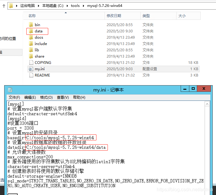 3、在mysql目录下手工创建 my.ini 文件,如上图,文件内容如下,basedir 和 datadir 修改为相应地址: