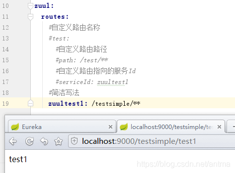 地址的 zuultest1 表示注册至eureka 的服务名,test1 表示api路径。