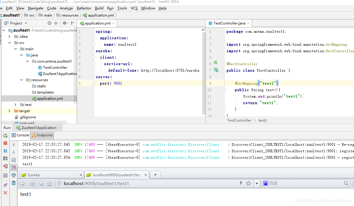 启动后,访问http://localhost:9000/zuultest1/test1 即可看到已路由成功: