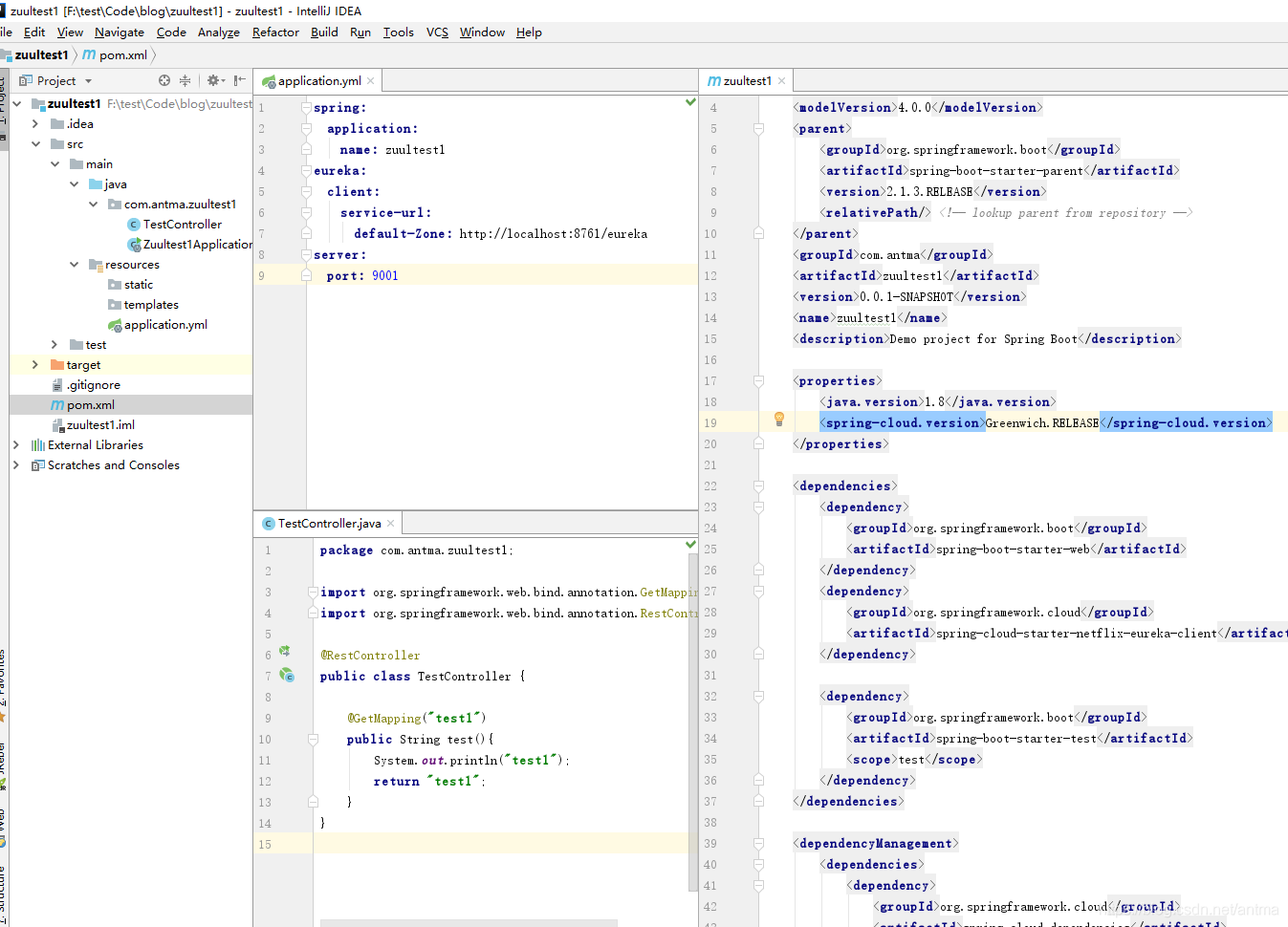 5、创建测试项目zuultest1,配置及Controller写一个测试api如下: