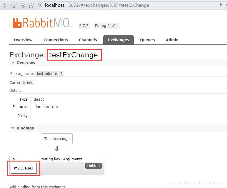 可以看到 myQueue3 绑定了 testExChange ,如下图: